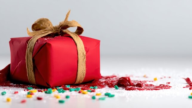 A beautifully wrapped red gift adorned with a rustic bow sits amid playful colorful sprinkles and a splotch of red, perfectly capturing the festive spirit of the holiday season.