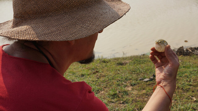 blowfish held in the hands of a tourist