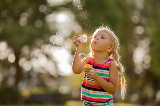 Girl blowing bubbles outdoors in bright daytime scene