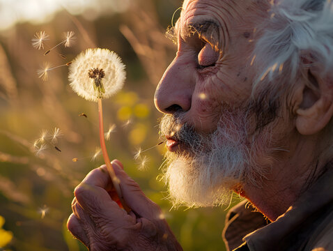 Portrait of smiling elderly man happily blowing dandelions in outdoor park, surrounded by nature's beauty.
