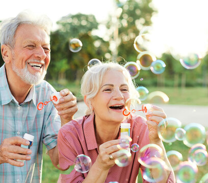 woman man senior couple  together elderly active happy retirement bubble soap blowing fun blow vitality bonding park outdoor leisure park fun