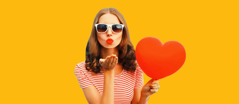 Portrait of beautiful young woman with red heart shaped balloon blowing her lips sending sweet air kiss wearing sunglasses, yellow shirt on white background
