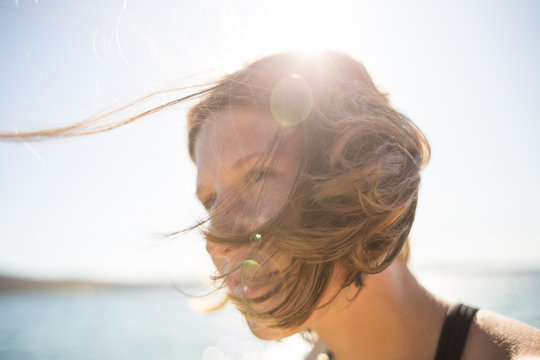 Portrait of beautiful latin woman at the beach enjoying the wind. She is smiling happily. Long hair is blowing in wind. Clear sky, turquoise sea at the background. Concept of freedom travel holidays.