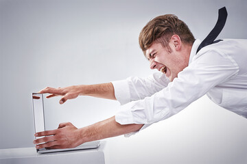 Stressed businessman desperately trying to press the delete button on his laptop computer
