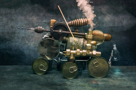 Still life with blowtorch, drill and canned food
