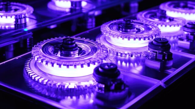 Mechanical actuator gears and rotating mechanisms set against a glowing neon purple background, emphasizing futuristic design
