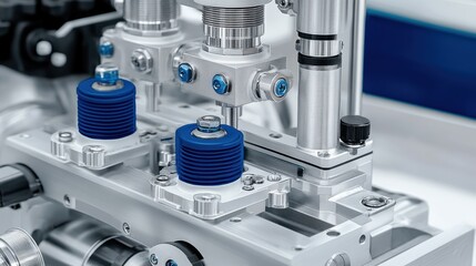 A complex mechanical setup with blue metal pipes feeding into hydraulic systems, surrounded by control levers and dials, photo-realistic, precision engineering