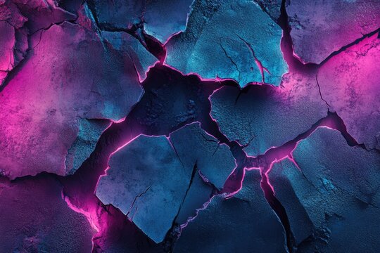 Abstract image of cracked surface illuminated with vibrant pink and blue neon lights.
