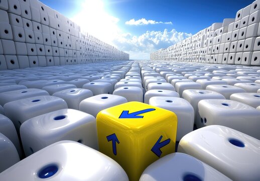 White blocks with blue arrows splitting around yellow question mark blocks on a gray surface concept