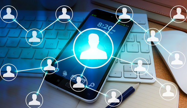Illustration of a man reaching out to touch a network of interconnected blue avatar icons. Represents connections, teamwork, and social interact