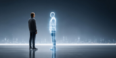 Digital avatar future. A man stands facing his glowing blue avatar in a futuristic setting