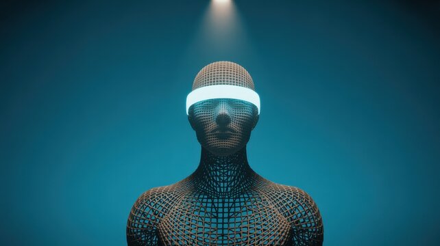 A futuristic humanoid figure with a glowing headband stands against a deep blue backdrop, illuminated by a bright spotlight overhead, creating a sense of mystery