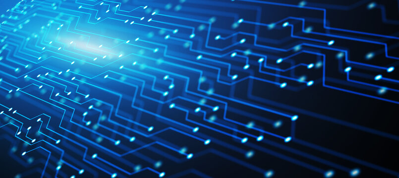 Glowing circuit lines on dark blue background