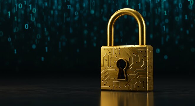 Golden padlock with circuit board design on dark background with blue binary code