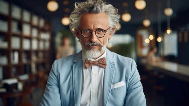 Male model posing wearing couture bow-covered coat and floral tie for fashion editorial