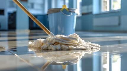 Close-up of a wet mop and blue bucket on a clean shiny floor inside a bright room, symbolizing cleanliness and hygiene.