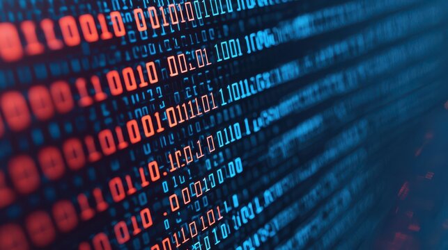 Abstract digital representation of binary code in blue and red hues, symbolizing data processing and technology.
