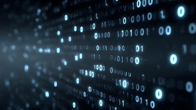 Abstract stream of glowing blue binary code on a dark digital background