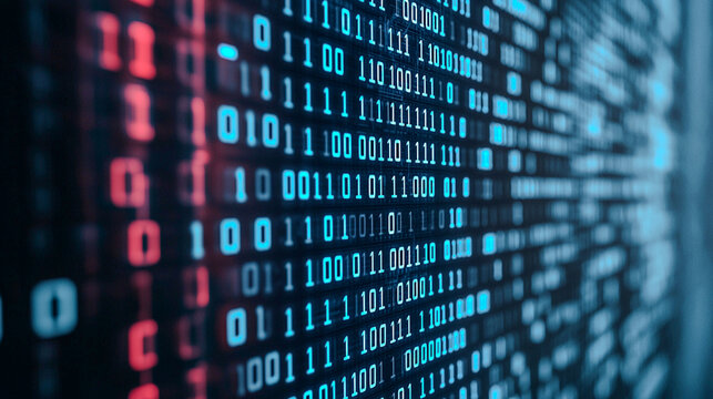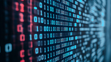 A close-up view of binary code displayed in vibrant blue and red colors, representing digital data and technology.