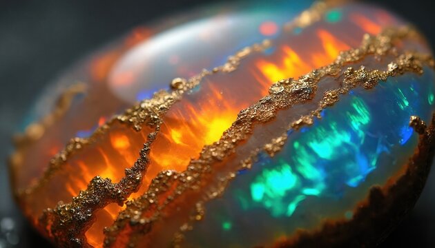A mesmerizing collection of polished, vibrantly colored gemstones with intricate patterns, displayed on a dark, reflective surface.