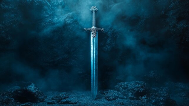 Fantasy sword in misty blue cave with mysterious aura. Generative AI