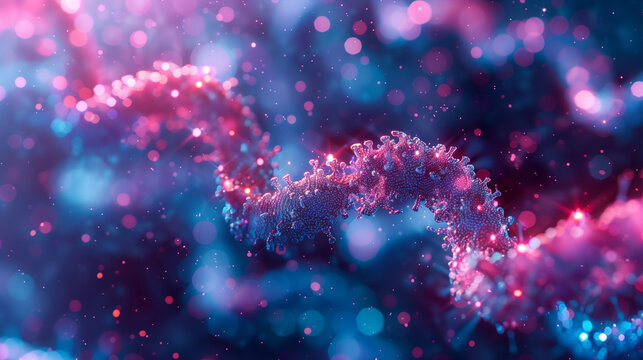 A close up of a DNA strand with a blue and red hue. The strand is surrounded by a blurry background