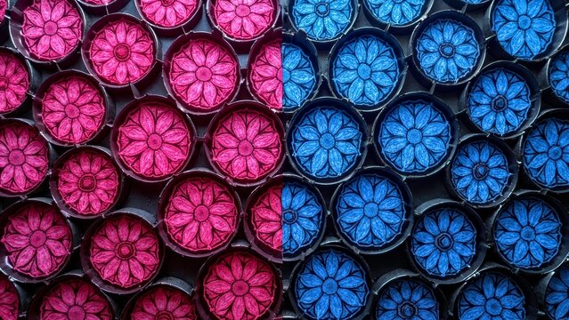 Abstract artwork with red and blue circular patterns radiating from a bright center