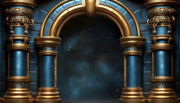 Ornate Golden Archway with Blue Columns and Starry Night Background