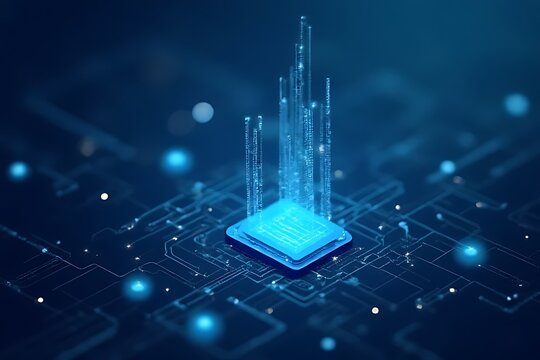 Close-up of a glowing blue computer processor chip on a circuit board.