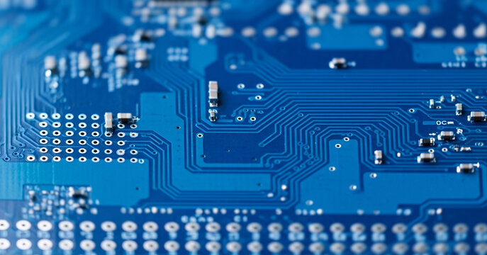 Close-up of a blue computer circuit board with visible traces and components, showcasing digital connectivity, precise electronic details, and a modern high-tech abstract style.