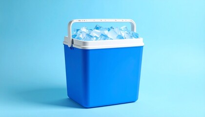 Blue cooler with open white lid revealing ice cubes on light blue background