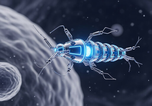 Futuristic microscopic nanobot with glowing blue core navigates through a cellular environment with organic tissue and other cells in the background