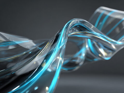 Dynamic abstract ribbon of translucent glass with a glowing blue core and elegant light refractions on a dark backdrop.