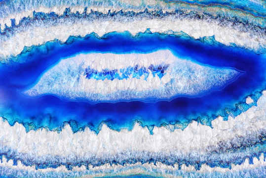 Amazing white blue Agate Crystal cross section. Natural translucent agate crystal surface, Blue abstract structure slice mineral stone macro closeup. Beautiful unique detail texture of blue stone