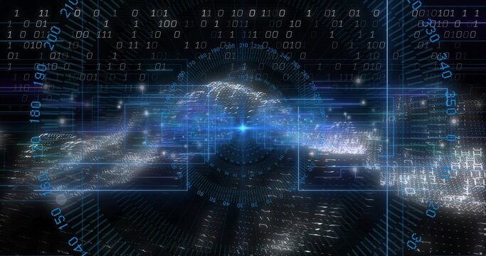Displaying stylized world map with white outlines on digital dashboard showing blue grid, numerals