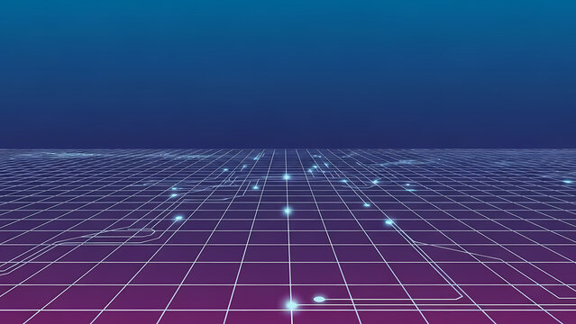 A futuristic digital landscape with a grid and glowing blue dots