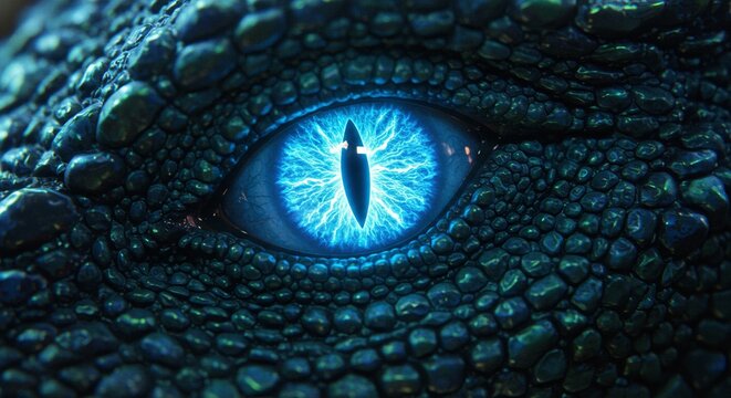 Intense blue dragon eye with scale details. The striking blue eye glows with inner power, set against a dark, textured hide.
