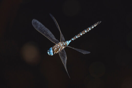 Blue dragonfly photographed in flight.