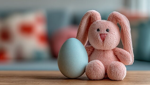 Pink bunny toy sits beside pastel blue egg on light brown table, blurred home background