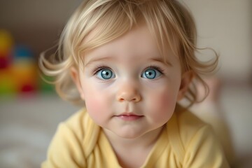 portrait of cute baby girl 10 months with blue eyes in brown bodysuit on white bedding on bed