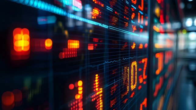 Futuristic digital interface with stock tickers and analytics