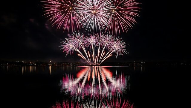 Spectacular fourth of july fireworks illuminate the night sky above a city skyline reflecting on the water