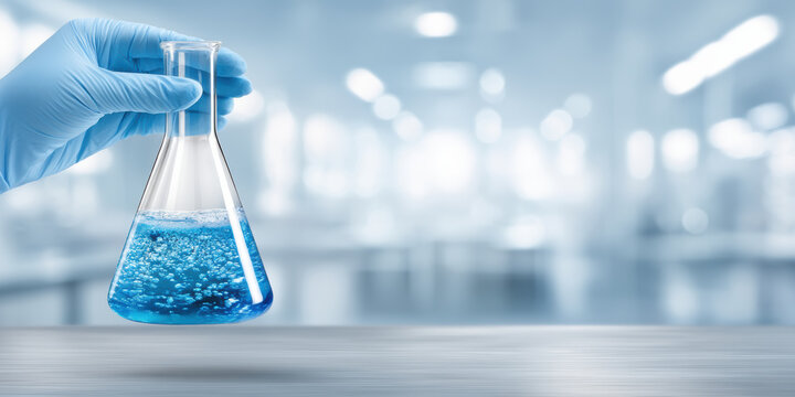 Blue flask bottle in hand in blue gloves, close-up, macro. Photo in modern laboratory