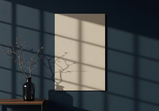 Empty beige poster or canvas hanging on a navy blue wall with soft grid shadows from a window. Elegant interior design with decorative tree branch, serene and creative atmosphere