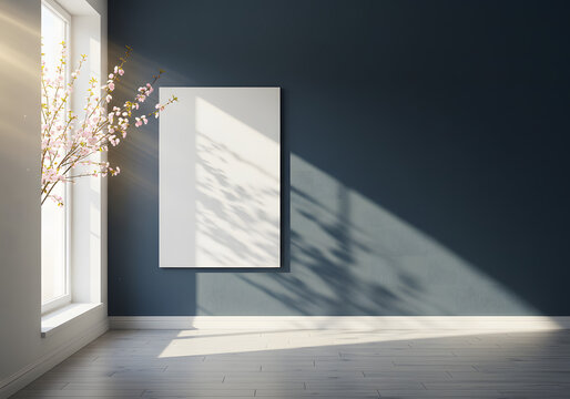 Blank canvas hanging in a quiet sunlit room with navy walls, soft shadows, and blooming branch from a nearby window. Artistic, peaceful mood with minimalist decor
