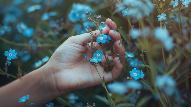 Selective focus on woman s hand with gentle blue forget me nots against blurred floral backdrop