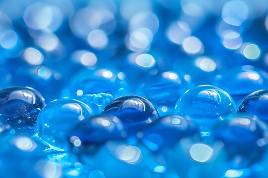 Vibrant close-up of blue gel marbles with soft bokeh background. Concept of blue Monday