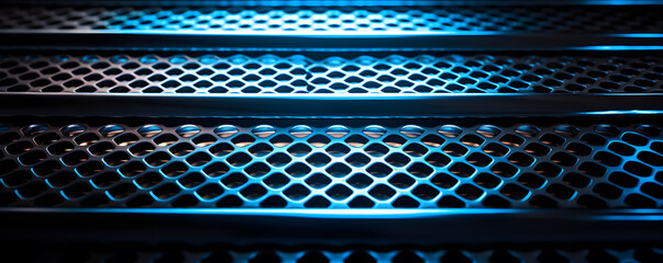 Close-up of industrial metal grid floor with glowing blue and orange lights