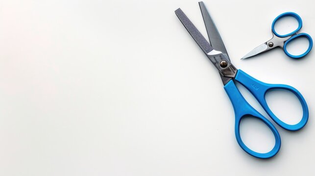 Blue handled school scissors on white background Central layout Overhead view with space for text