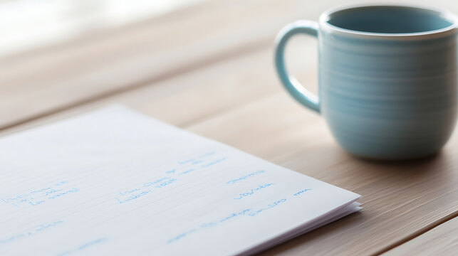A cozy desk scene features a blue ceramic mug and a sheet of paper with blue handwriting. The soft lighting and wooden surface create a serene atmosphere, inspiring creativity.